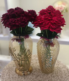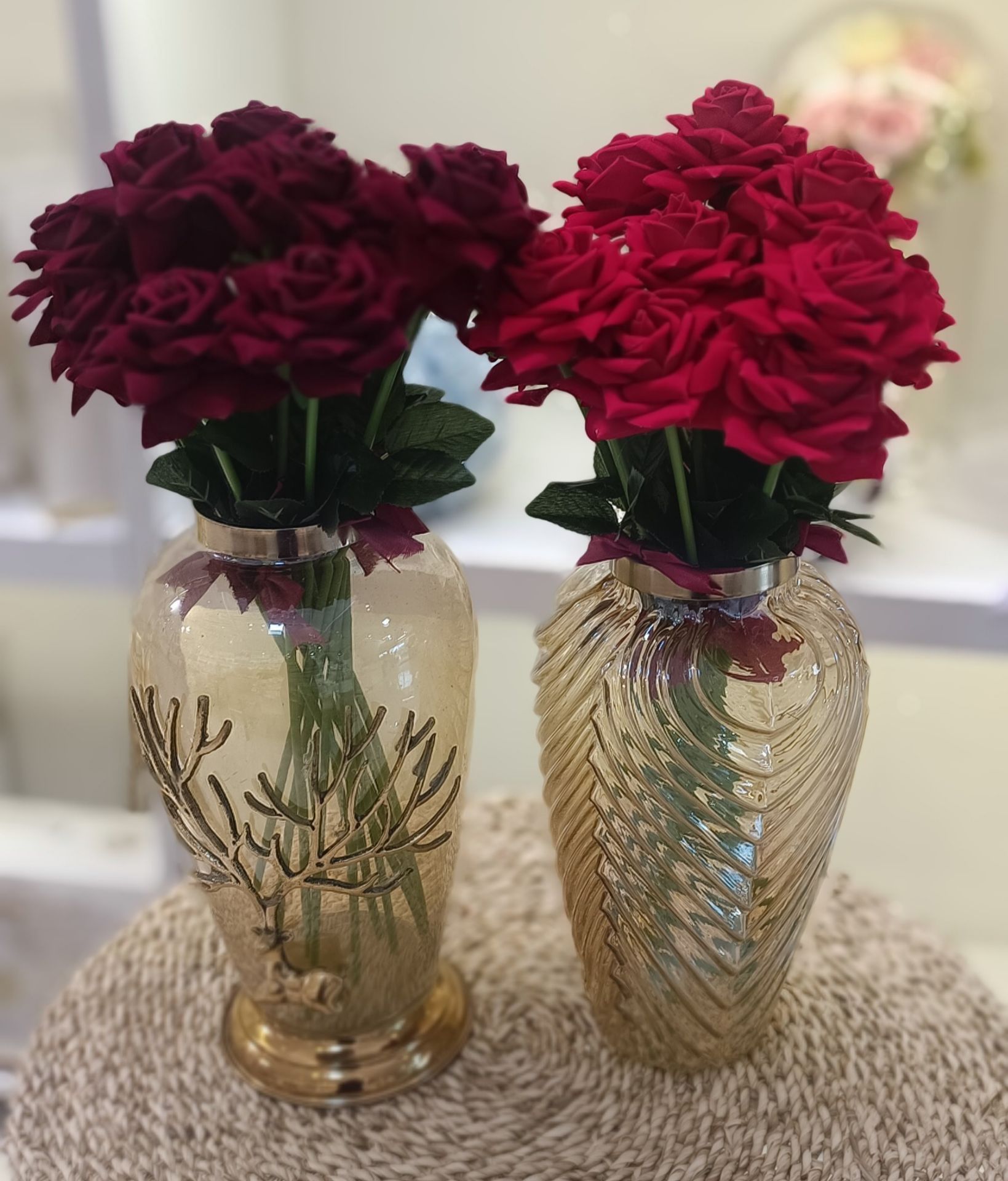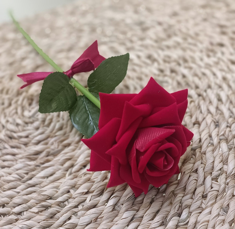 گل رز چیچک با ساقه 50 سانتی دارای شلنگی، برگ و پاپیون در دو رنگ قرمز و زرشکی