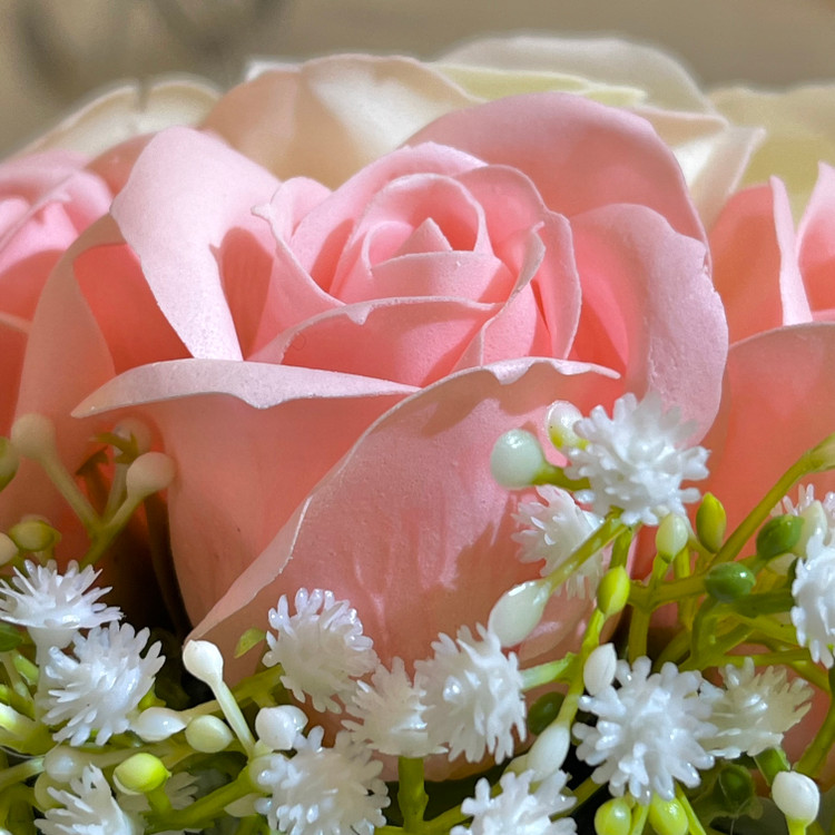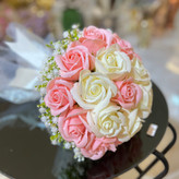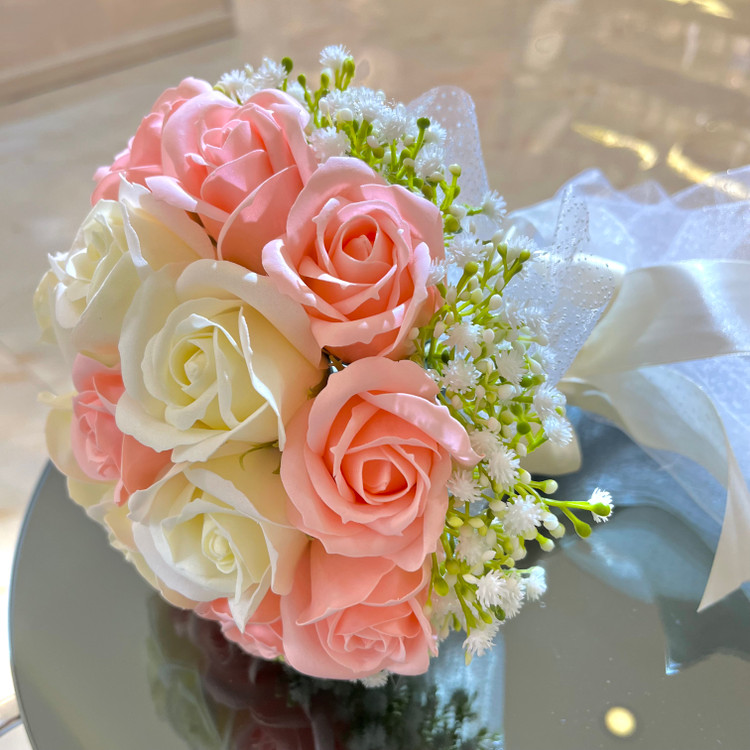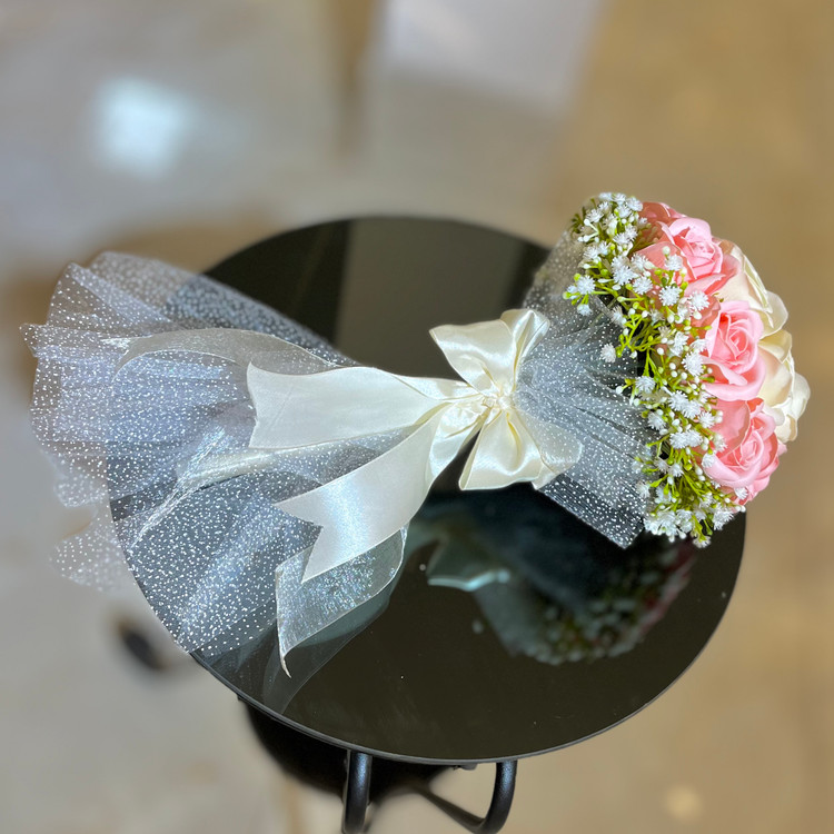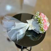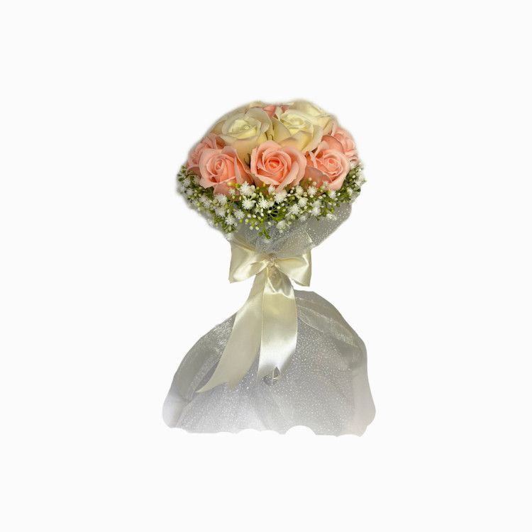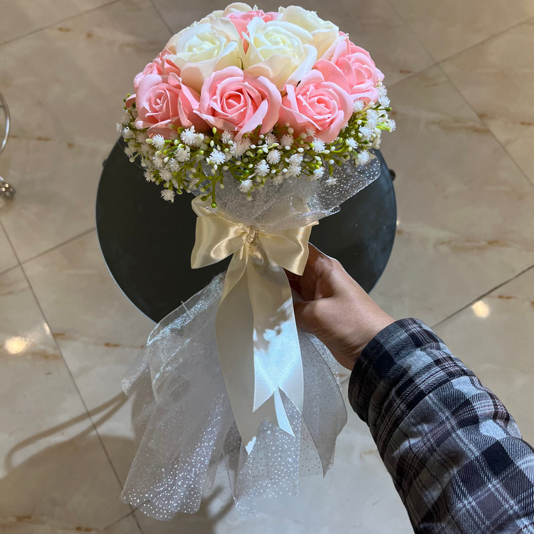 دسته گل عروس مدل رز صابونی صورتی و سفید گلسرای نداف